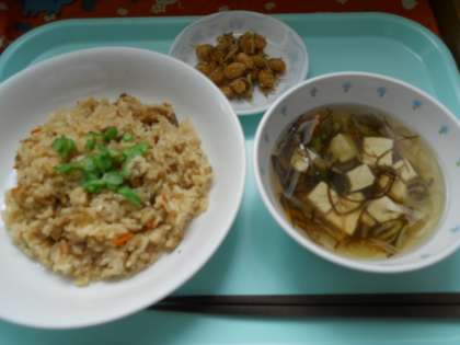7月11日火曜日 公開日 2017/07/11 更新日 2017/07/11 給食 鶏めし 大豆とじゃこのカリカリ揚げ もずくスープ 牛乳 産地情報 鶏肉(徳島)もずく(沖縄)人参(千葉)ごぼう(鹿児島)いんげん(青森)榎(長野)長ネギ(千葉) いいね(0)