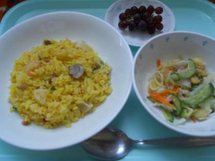 7月15日土曜日 公開日 2017/07/15 更新日 2017/07/15 給食 パエリア マカロニサラダ デラウェア 牛乳 産地情報 にんにく(青森)玉ねぎ(愛知)人参(千葉)ピーマン(岩手)赤ピーマン(高知)きゅうり(岩手)キャベツ(長野)鶏肉(徳島)デラウェア(山形) いいね(0)