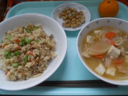 12月20日水曜日 公開日 2017/12/21 更新日 2017/12/21 給食 鶏めし のり塩大豆 豚汁 みかん 牛乳 産地情報 人参(千葉)ごぼう(青森)いんげん(長崎)大根(神奈川)長ネギ(埼玉)みかん(和歌山)鶏肉(岩手)豚肉(岩手)青のり(愛知) いいね(0)