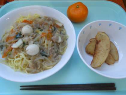 豚肉(岩手)イカ(ペルー)しょうが(高知)にんにく(青森)人参(東京)玉ねぎ(北海道)キャベツ(愛知)もやし(山梨)チンゲン菜(静岡)じゃがいも(北海道)みかん(静岡)
