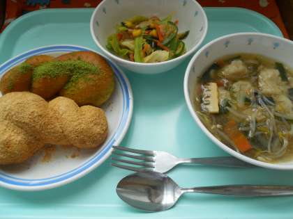 2月16日金曜日 公開日 2018/02/16 更新日 2018/02/16 給食 〈2年生リクエスト給食〉 揚げパン(抹茶・きな粉) ワンタンスープ 小松菜サラダ 牛乳 産地情報 豚肉(岩手)きゅうり(宮崎)人参(千葉)たけのこ(福岡)もやし(千葉)長ネギ(千葉)ニラ(高知)小松菜(埼玉)キャベツ(愛知)玉ねぎ(北海道) いいね(0)