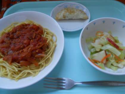 2月20日火曜日 公開日 2018/02/20 更新日 2018/02/20 給食 スパゲティアラビアータ コールスロー さつま芋とりんごのパイ 牛乳 産地情報 にんにく(青森)玉ねぎ(北海道)キャベツ(愛知)人参(東京)さつま芋(千葉)りんご(山形)鶏肉(宮崎)ベーコン(茨城) いいね(0)