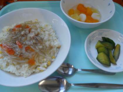 3月1日木曜日 公開日 2018/03/01 更新日 2018/03/01 給食 あんかけチャーハン 中華風きゅうり フルーツ白玉 牛乳 産地情報 長ネギ(千葉)しょうが(高知)もやし(千葉)大根(神奈川)人参(千葉)きゅうり(宮崎)豚肉(岩手)卵(秋田) いいね(0)