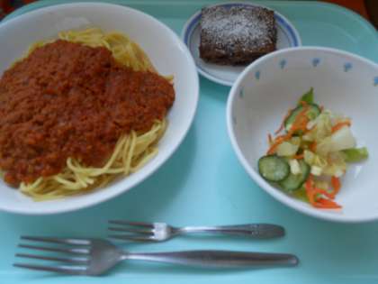3月14日水曜日 公開日 2018/03/14 更新日 2018/03/14 給食 <3年生リクエスト給食> スパゲティミートソース チーズ入りサラダ チョコチップブラウニー 牛乳 産地情報 にんにく(青森)玉ねぎ(北海道)人参(千葉)セロリ(静岡)パセリ(香川)キャベツ(愛知)きゅうり(宮崎)豚肉(岩手)マッシュルーム(岡山)卵(秋田) いいね(0)