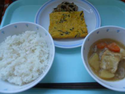 豚肉(岩手)鶏肉(徳島)人参(北海道)いんげん(青森)もやし(静岡)小松菜(東京)玉ねぎ(北海道)じゃがいも(北海道)ひじき(長崎)切干大根(宮崎)卵(秋田)