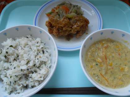 10月18日木曜日 公開日 2018/10/18 更新日 2018/10/18 給食 わかめご飯 鶏のから揚げねぎソース 春雨入り野菜炒め 中華風コーンスープ 牛乳 産地情報 しょうが(高知)長ネギ(青森)にんにく(青森)玉ねぎ(北海道)人参(北海道)キャベツ(群馬)もやし(千葉)ニラ(山形)パセリ(長野)卵(秋田)ちりめん雑魚(広島)鶏肉(宮崎) いいね(0)