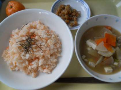 11月8日木曜日 公開日 2018/11/08 更新日 2018/11/08 給食 <1年C組リクエスト和食> 鮭ご飯 大豆とじゃこのカリカリ揚げ 豚汁 みかん 牛乳 産地情報 塩鮭(チリ)ちりめんじゃこ(広島)豚肉(青森)人参(北海道)ごぼう(青森)大根(青森)じゃがいも(北海道)長ネギ(秋田)みかん(熊本) いいね(0)