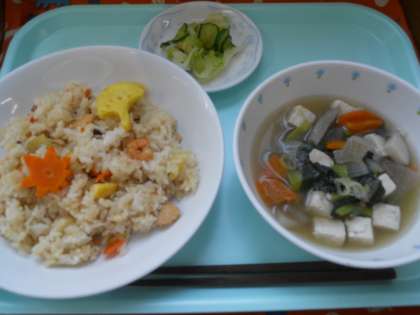 鶏肉(青森)ムキエビ(マレーシア)さつま芋(千葉)人参(千葉)しめじ(長野)たけのこ(福岡)きゅうり(宮崎)キャベツ(三浦)ごぼう(青森)大根(千葉)里芋(埼玉)小松菜(埼玉)長ネギ(青森)栗(熊本)