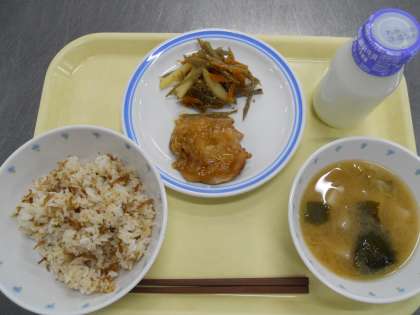 5月22日(水) 公開日 2019/05/31 更新日 2019/05/31 給食 ・煮じゃこごはん ・みそ汁 ・鶏肉の葱ソース ・金平煮 ・牛乳 食材産地 ・生姜(高知)・長葱(茨城)・にんにく(青森)・じゃが芋(静岡)・ごぼう(青森)・人参(徳島)・里芋(宮崎)・長葱(茨城)・ちりめんじゃこ(広島)・鶏肉(徳島、岩手) いいね(0)