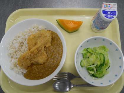 5月31日(金) 公開日 2019/06/13 更新日 2019/06/13 給食 ☆運動会応援献立☆ ・チキン勝つカレー ・グリーンサラダ ・果物(メロン) ・ジョア 食材産地 ・にんにく(青森)・生姜(高知)・玉葱(香川)・セロリ(長野)・人参(徳島)・じゃが芋(長崎)・キャベツ(神奈川)・きゅうり(宮崎)・さやいんげん(千葉)・メロン(茨城)・鶏肉(徳島) いいね(0)