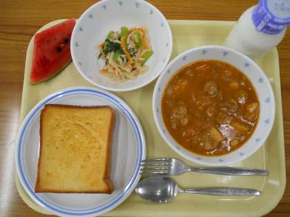 6月5日(水) 公開日 2019/06/13 更新日 2019/06/13 給食 ・レモンシュガートースト ・トマトシチュー ・ツナサラダ ・果物(すいか) ・牛乳 食材産地 ・にんにく(香川)・生姜(高知)・玉葱(兵庫)・人参(千葉)・じゃが芋(静岡)・パセリ(静岡)・大根(千葉)・小松菜(埼玉)・すいか(熊本)・豚肉(鹿児島) いいね(0)