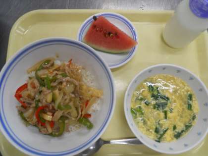 6月17日(月) 公開日 2019/06/17 更新日 2019/06/17 給食 ・青椒肉絲丼 ・にら玉スープ ・果物(すいか) ・牛乳 食材産地 ・にんにく(青森)・生姜(高知)・玉葱(兵庫)・ピーマン(茨城)・赤ピーマン(高知)・長葱(茨城)・にら(千葉)・すいか(熊本)・豚肉(青森)・鶏卵(群馬) いいね(0)