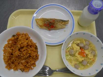 6月21日(金) 公開日 2019/07/03 更新日 2019/07/03 給食 ・チキンライス ・ウインナーと卵のスープ ・たらのエスカベージュ ・牛乳 食材産地 ・にんにく(青森)・玉葱(兵庫)・人参(千葉)・ピーマン(茨城)・パセリ(千葉)・赤ピーマン(高知)・じゃが芋(静岡)・キャベツ(秋田)・助宗たら(アメリカ原料)・鶏肉(青森)・鶏卵(群馬) いいね(0)