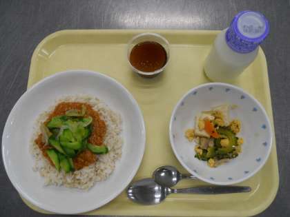 ・にんにく(青森)・玉葱(愛知)・人参(青森)・レタス(長野)・きゅうり(青森)・ゴーヤ(長崎)・豚挽肉(青森、鹿児島)・鶏肉(徳島)・鶏卵(群馬)