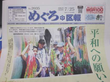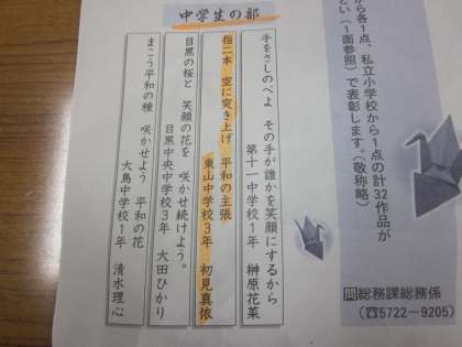 さて、7月25日発行の「めぐろ区報」に3年A組の初見真依さんの平和記念標語が掲載されています。