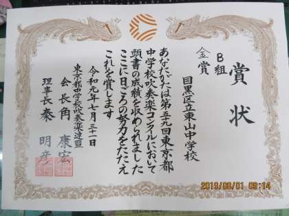 吹奏楽部 金賞! おめでとう!! 公開日 2019/08/01 更新日 2019/08/01 学校行事 本校、吹奏楽部が「第59回東京都中学校吹奏楽コンクール」にて、見事3年ぶりに金賞を受賞しました!おめでとう! いいね(0)