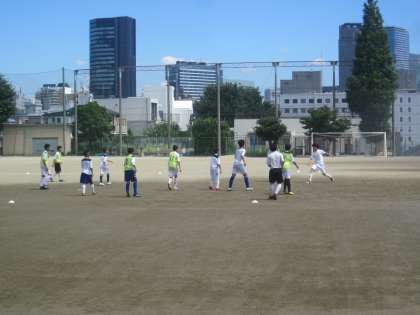 校庭ではスプリンクラーで水撒きしてもすぐに乾いてしまう中、サッカー部が練習しています。