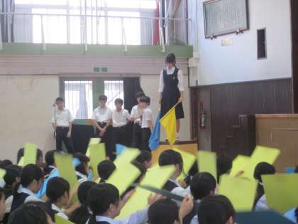 明日の区連体本番へ向けて壮行会が行われました。84名の選手団です。全校生徒の4分の1ですね。4分の3は応援に全力を尽くします。