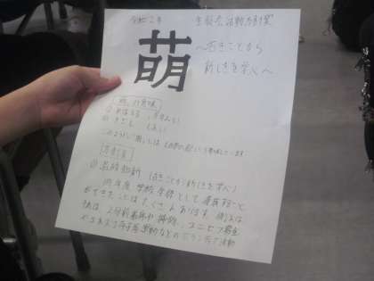 生徒会役員本部が決めた漢字は『萌』です。(芽生え、兆し)