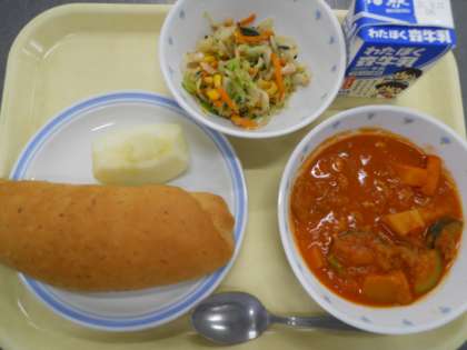 <献立>セサミパン 夏野菜のトマト煮込み 彩野菜とツナのサラダ りんご