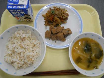 <献立>ごまごはん 鰹の角煮 五目金平 味噌汁