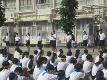 東山中伝統の行進練習、本来は5分ですが、移動なしで2分半。それでもかなり長いです。歩くよりもその場での行進は難しいですね。それでも頑張っていました。