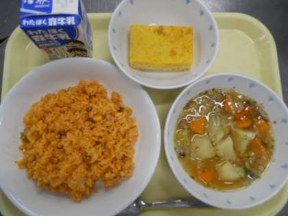 <献立>チキンライス  ツナ入りオムレツ  ベーコンと野菜のスープ