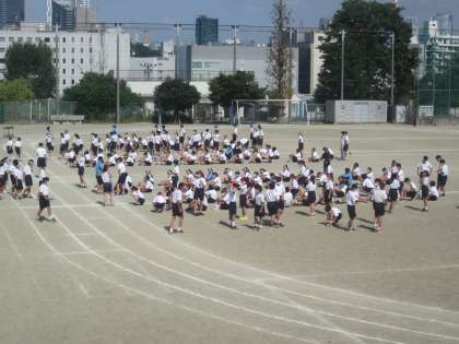 生徒は自主的に時間を見て動くわけですが、全体練習2回目、校庭に集まり他学年の基準となるべく3年生は1番に整列完了しています。