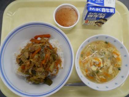 <献立>回鍋肉丼  中華風卵スープ  ミルクゼリーいちごソースかけ