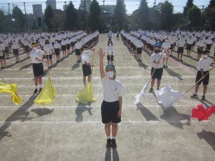 素晴らしい秋晴れの中、予行を実施しています。日射しが強く日焼け間違いなしです。