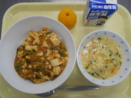 <献立>麻婆豆腐丼  中華風卵スープ  みかん