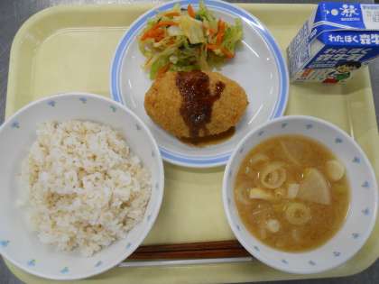 10月15日献立 公開日 2021/10/15 更新日 2021/10/15 給食 <献立>ご飯 ポテトコロッケ 野菜の辛子醤油和え 味噌汁 <産地>人参(北海道)、玉ねぎ(北海道)、じゃが芋(北海道)、キャベツ(長野県)、小松菜(東京都)、大根(青森県)、長ネギ(青森県)、豚肉(青森県) 朝早くからじゃが芋をふかして潰し、炒めたひき肉や野菜と合わせ、一つ一つ丁寧に丸めて手作りでコロッケを作りました。衣が薄く、カリッと上がりました。 いいね(0)