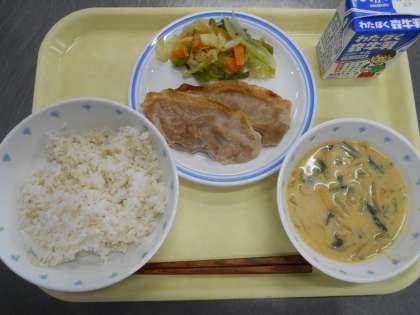 <献立>ご飯 豚肉の生姜焼き 野菜炒め 豆乳の味噌汁
