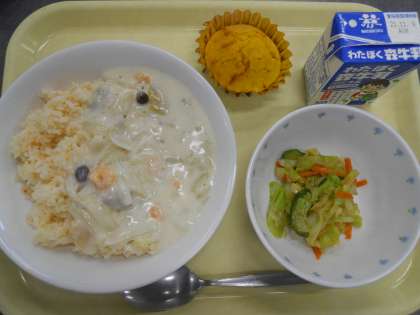 <献立>キャロットライス海老クリーム 野菜サラダ パンプキンマフィン