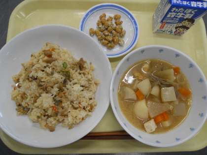 <献立>鶏めし のり塩大豆 豚汁