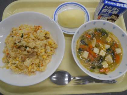 <献立>五目チャーハン 中華スープ りんご