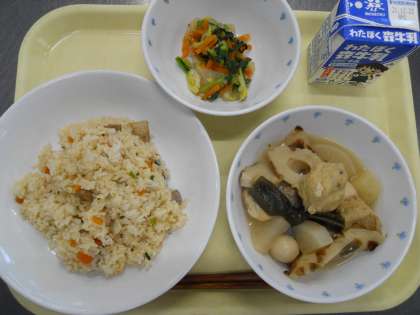 寒くなると温かいおでんが食べたくなります。今日のおでんには、大根、じゃが芋、こんにゃく、結び昆布、焼き竹輪、がんもどき、生揚げ、うずらの卵の8種類の具が入っています。配膳で何が入るかはお楽しみですね。白菜の和え物にはねり梅を使い、梅の風味を感じます。