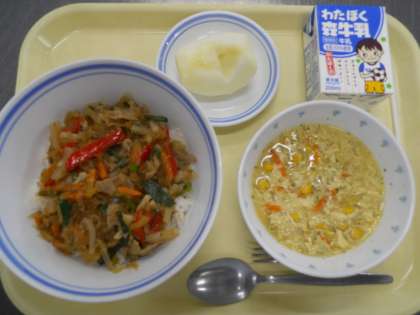 <献立>チャプチェ丼 中華風コーンスープ りんご