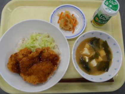 今日は、給食室より明日の区連体を応援する気持ちを込めて「ソース勝つ丼」です。ソースカツ丼は福井県の郷土料理で、一般的なカツ丼は、揚げたカツを卵でとじてご飯に乗せていますが、福井県のカツ丼と言えば、ソースに浸したカツをご飯の上に乗せた丼のことを言います。