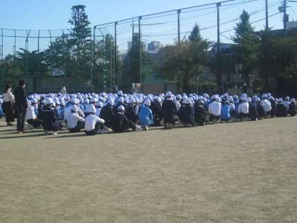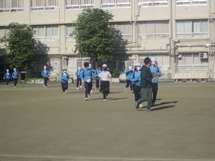 ヘルメットをかぶり、教室は窓を開けてカーテン閉めて、校庭では走っていました。