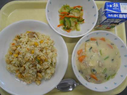 <献立>大豆ピラフ あすかチャウダー じゃこのカリカリサラダ