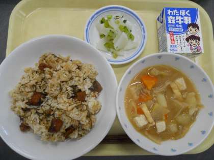 <献立>かつおめし 豚汁 かぶと大根のゆず香漬け