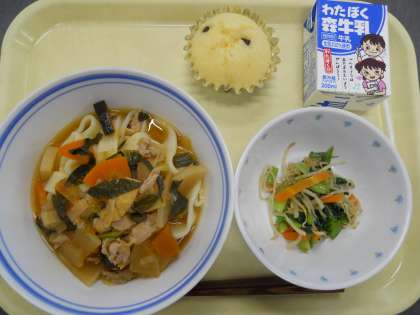 <献立>ほうとううどん 茹で野菜のピリ辛醤油かけ レーズン蒸しパン