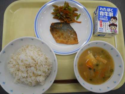 11月24日は「いいにほんしょく」と読んで「和食の日」です。和食の味の基本である「だし」を活かした味噌汁や、海外ではほとんど食べられていない「ごぼう」を使った献立です。2013年にユネスコ無形文化遺産に登録された「和食」を今後も継承していくために、今私たちができることは何か、考えるいい機会だと思います。和食の日のチラシを配布しましたので、ご家族でご覧ください。