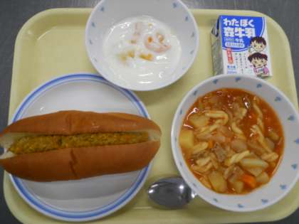 <献立>ミートドックサンド  ミネストローネスープ  フルーツヨーグルト