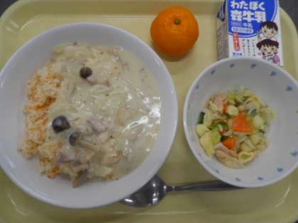 11月30日献立 公開日 2022/11/30 更新日 2022/11/30 給食 <献立>キャロットライスクリームソースかけ ツナ入りマカロニサラダ みかん <産地>人参(千葉県)、玉ねぎ(北海道)、しめじ(長野県)、きゅうり(千葉県)、キャベツ(愛知県)、みかん(愛媛県)、鶏肉(青森県) いいね(0)