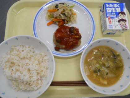 今日は豆腐の入ったハンバーグですので、所々に豆腐の白い部分が残っています。豆腐は淡白な味ですので、洋風の濃いソースを合わせています。ソテーは乾物の切干大根をベーコンと合わせた洋風の炒め物です。和と洋の組み合わせですね。
