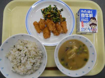 <献立>わかめご飯  いかのかりん揚げ  ごま和え  味噌汁