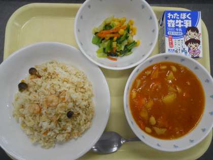 <献立>シーフードピラフ  鶏肉のスープカレー  小松菜とコーンのサラダ