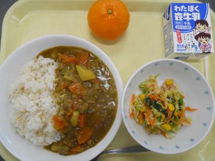 1月18日献立 公開日 2023/01/18 更新日 2023/01/18 給食 <献立>カレーライス 彩野菜とツナのサラダ みかん <産地>にんにく(青森県)、生姜(高知県)、玉ねぎ(北海道)、人参(千葉県)、じゃが芋(北海道)、キャベツ(愛知県)、小松菜(埼玉県)、みかん(和歌山県)、豚肉(青森県) 昨日は「よーいどん!もぐもぐ給食運動会」初日でしたが、配膳時間も短く、残食も少なかったです。 いいね(0)